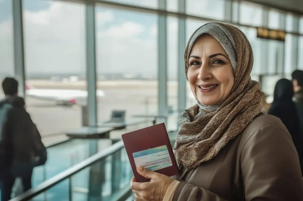 Happy traveler holding a passport and UAE outpass at the airport
